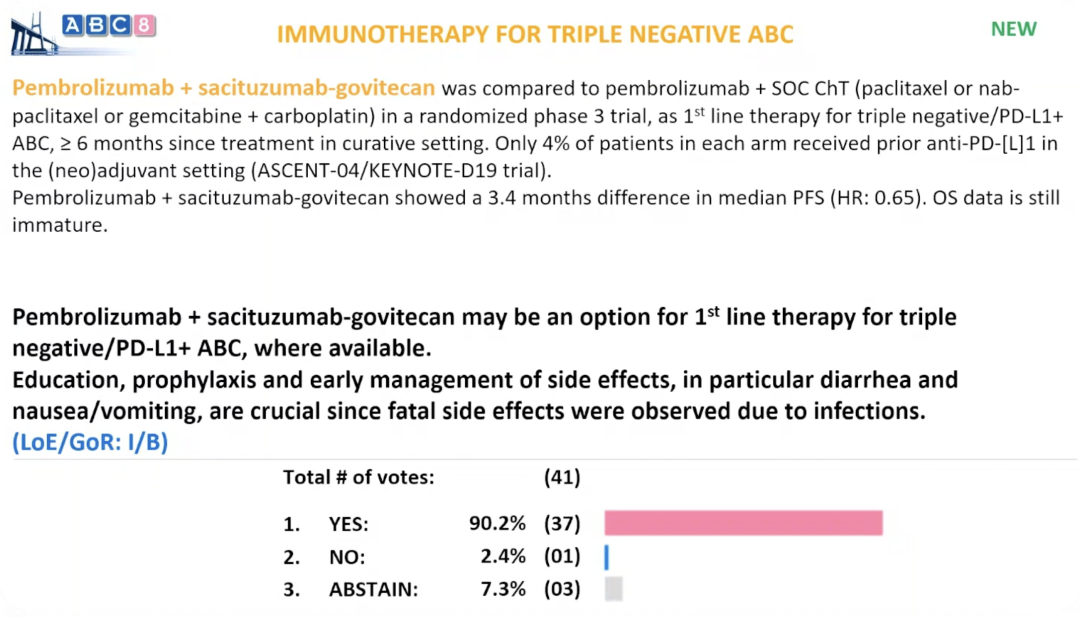 △ABC8国际指南专家投票结果:基于ASCENT-04研究结果,对于PD-L1阳性的晚期TNBC患者,SG联合帕博利珠单抗可作为一线治疗选择(证据水平/推荐级别:I/B)