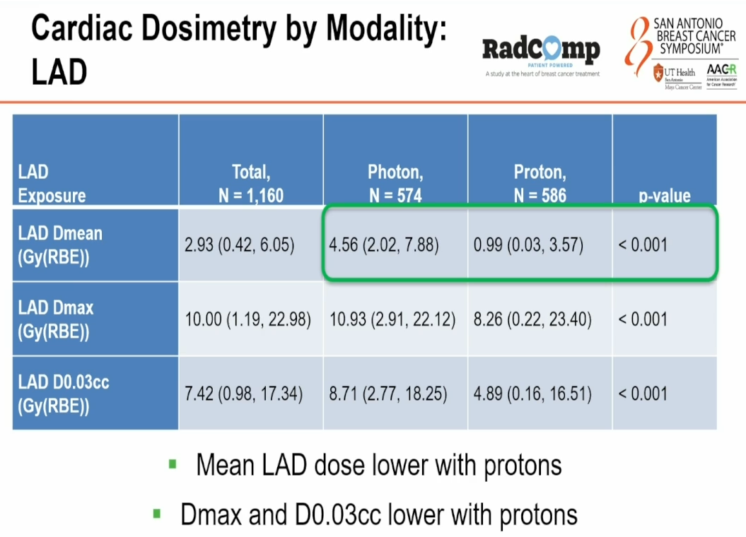 在RadComp试验的1160名受试者中,质子放疗与光子放疗对心脏亚结构的辐射暴露存在显著差异,且受病变偏侧影响。质子放疗组的中位平均心脏剂量显著低于光子放疗组(0.9 Gy[Q1–Q3:0.49–1.46]vs.2.83 Gy[1.49–4.52],p<0.001);右侧病变的平均心脏剂量显著低于左侧及双侧病变(0.91 Gy[0.44–1.55]vs.1.99 Gy[1.11–3.63],p<0.001)。质子放疗组的冠状动脉左前降支、左心房、左心室及右心房平均剂量在显著降低(p<0.001)。然而,对于全心、右心房及右心室,小体积参数(如0.03cc)所受的最大剂量在质子放疗中更高。