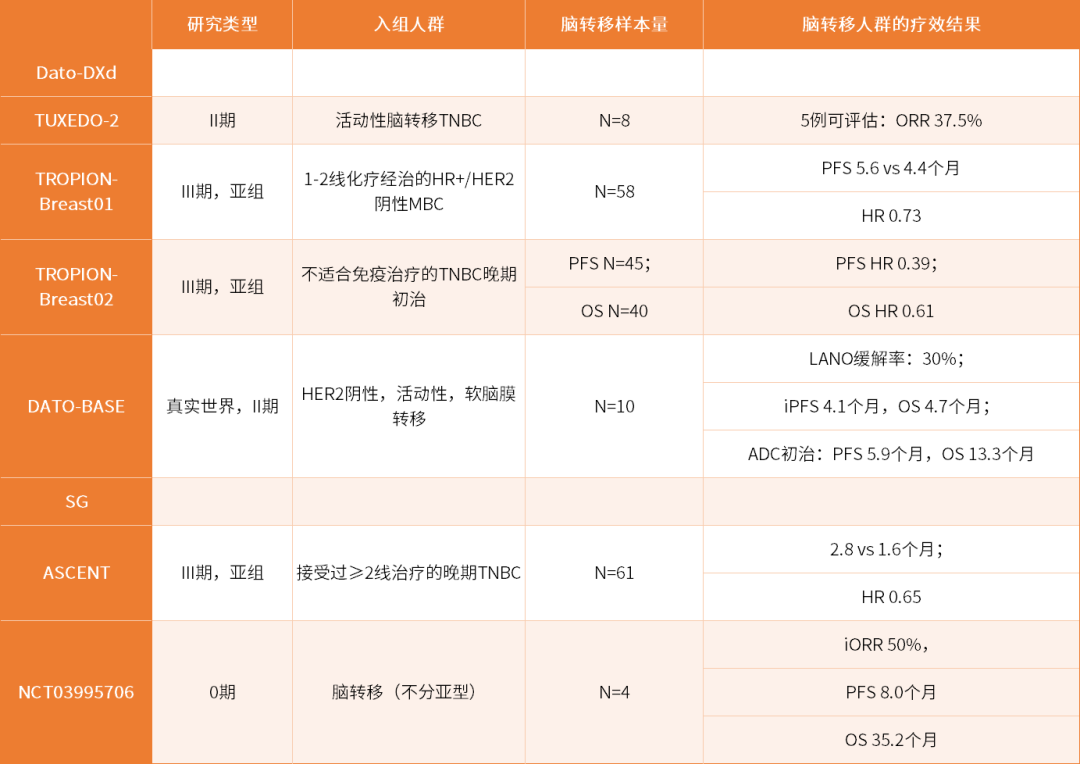 表1.已报道Trop2 ADC治疗HER2阴性乳腺癌脑转移的研究汇总(非头对头比较,请谨慎解读)
