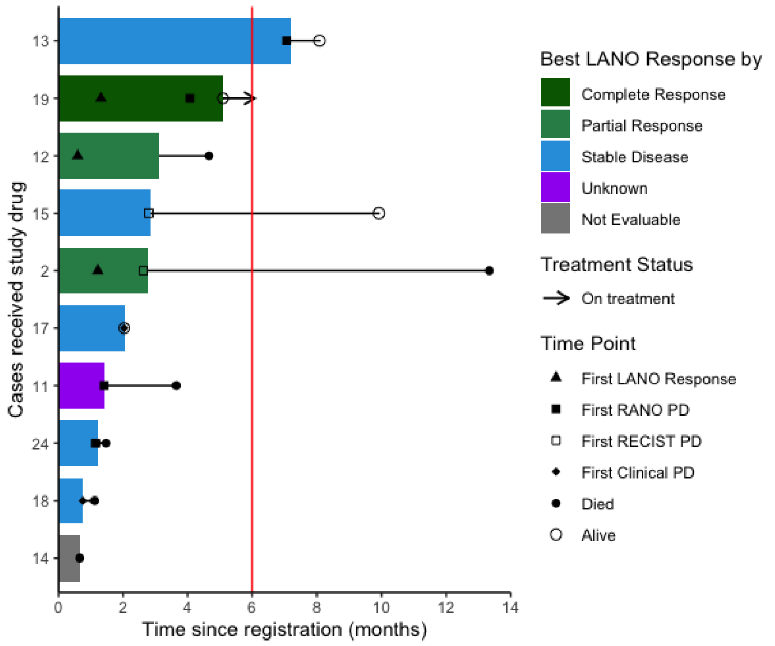 ≥2级的治疗相关不良事件(TRAE)发生率为70%(n=7/10),最常见为口腔炎(40%,n=4)、疲劳(30%,n=3)和恶心(30%,n=3);仅观察到1例4级TRAE(呼吸困难)。无患者发生间质性肺疾病(ILD)或5级TRAE。根据NANO评分,7例基线时有CNS症状的患者中,5例至少有一种症状得到改善,1例患者症状稳定,1例患者缺失随访NANO评估。