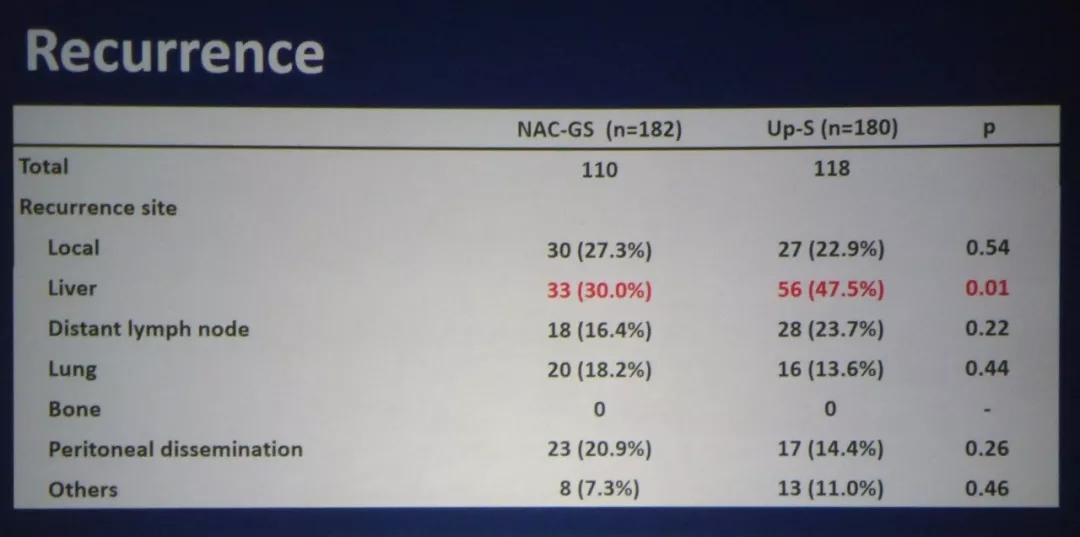 结果:NAC-GS 组的2年OS明显优于Up-S组(63.7% vs 52.5%),NAC-GS 组的中位生存期也明显优于Up-S组(36.72% vs 26.65%,P=0.015),NAC-GS 组的切除率优于Up-S组(93% vs 82%),NAC-GS组3级以上副反应主要为中性粒细胞/白细胞的减少(72.8%),术后病理分期发现NAC-GS组淋巴结阳性率明显低于Up-S组(59.6% vs 81.5% , p<0.01),两组均最易在肝脏复发,但NAC-GS组肝脏复发率明显低于Up-S组(30% vs 47.5%, p=0.01)。