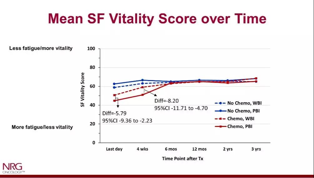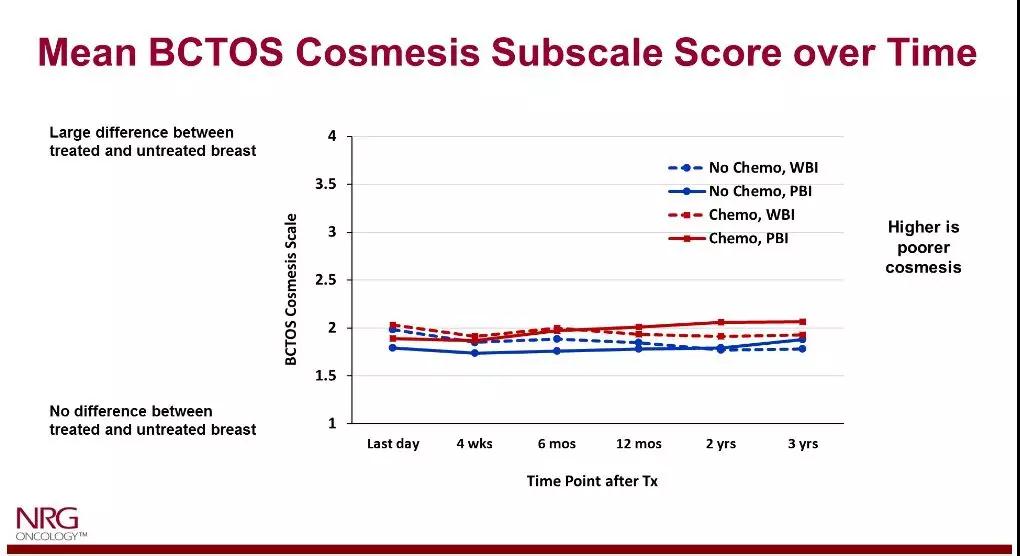 方法:NSABP B-39/RTOG 0413研究入组人群包括一项前瞻性生活质量亚组研究,采用BCTOS量表和SF-36量表对乳腺癌治疗效果(美容、功能、疼痛)和患者疲劳状态进行评价。主要目的包括比较从基线到辅助治疗结束时的疲劳变化,以及评估在随机分组前,辅助治疗结束4周、6个月、12个月、24个月和36个月后的美容变化。 因为化疗在分别在WBI之前,PBI之后实施,分别对化疗和非化疗组进行分析。