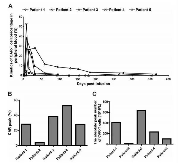 图1.CAR-T细胞在患者扩增情况。A流式方法检测IM19CAR-T在体内扩增及持续时间;B外周血中CAR-T细胞与患者淋巴细胞比值;C外周血中CAR-T细胞峰值水平