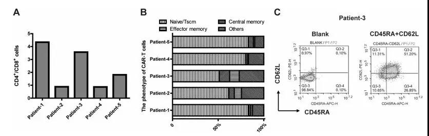 图2.流式细胞学监测外周血T细胞亚型。ACD4+/CD8+T淋巴细胞比值;BCD62LandCD45RA将T细胞分为三个亚型:初始/记忆性干细胞样T细胞(TSCM)(CD62L+CD45RA+);中央记忆型T细胞(TCM,CD45RA−CD62L+)和效应记忆型T细胞(TEM,CD62L-CD45RA-);C代表性病例3,其T细胞亚型。
