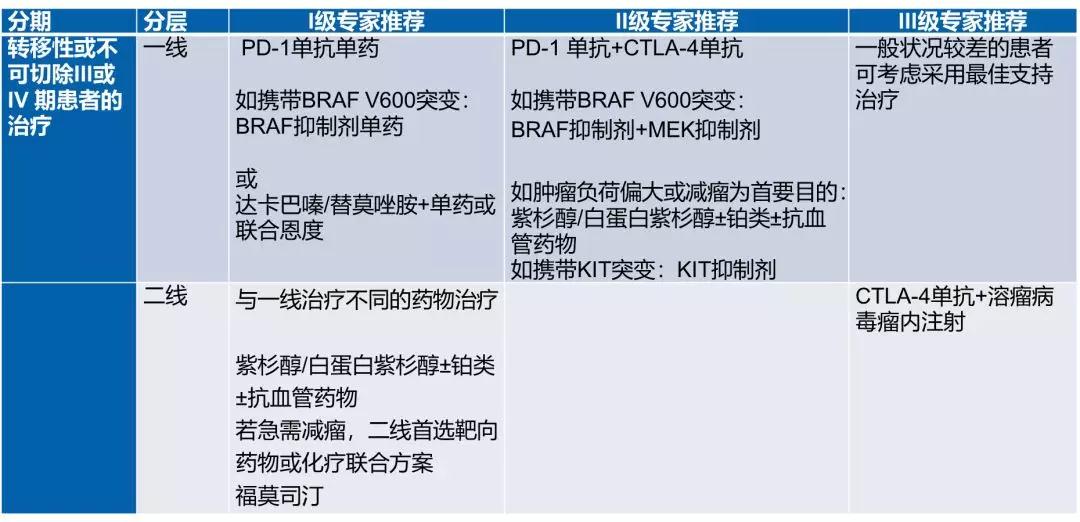 表1. 晚期皮肤黑色素瘤的治疗原则(2019CSCO黑色素瘤诊疗指南)