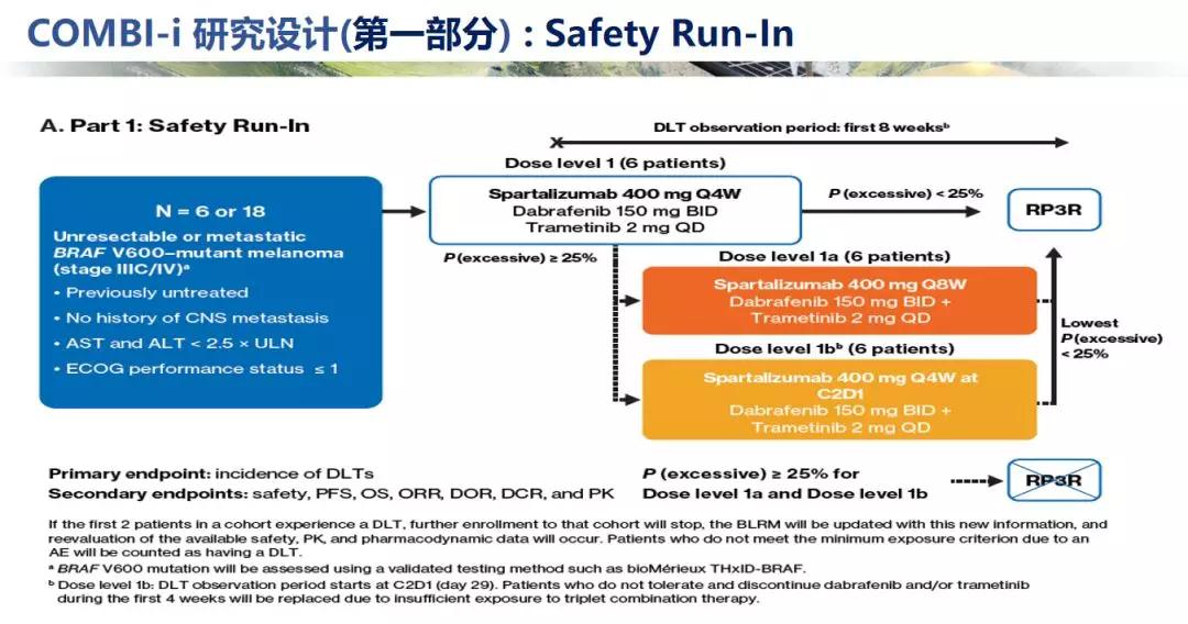 在此基础上,COMBI-I研究(Abs.9531)是一项达拉非尼+曲美替尼+PD-1单抗用于晚期BRAF V600突变黑色素瘤患者一线治疗的随机、双盲、安慰剂对照的III期研究。该研究分为三部分,共纳入536名患者,目前发表的第一和第二部分结果已显示,该联合治疗可显著提高应答率。