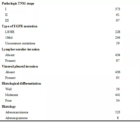 来自复旦大学上海癌症中心放射治疗科朱正飞团队进行了一项回顾性研究,该研究回顾性分析了2007年1月至2017年12月在复旦大学上海癌症中心接受手术切除治疗并对其术后样本进行了EGFR突变检测的NSCLC患者的临床病历资料。1183例行完整手术切除并接受符合NCCN指南推荐的标准辅助化疗的NSCLC患者术后组织进行EGFR突变检测,值得注意的是,这1183名EGFR突变检测患者的基线疾病特征(包括年龄,性别,TNM分期和肿瘤组织学特征等)和在同一时期内接受根治性NSCLC切除的整体人群是均衡的。最终,有531例EGFR突变NSCLC患者被纳入此研究中。筛选过程如下述流程图所示。