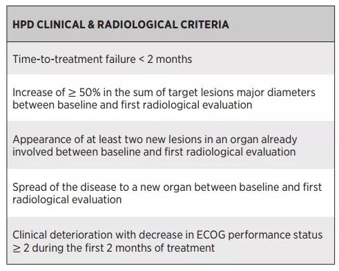 2018年Russo教授在CCR上进行了更为严谨完善的HPD临床/放射学标准的定义,将新发病灶及ECOG评分的改变纳入了相关定义(表1)。