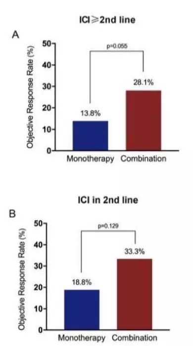 在≥二线治疗的患者中,与单药治疗相比,ICIs联合化疗显示了更好的ORR(28.1% vs. 13.8%, P=0.055)及PFS( 4.9 vs 2.5个月, P=0.005)。OS尚不成熟。在96例二线治疗的患者中(ICIs单药69例,联合治疗27例),两组的ORR和PFS分别为(33.3% vs 18.8%, P=0.129)和(4.9 vs 2.9 个月, P=0.041)。