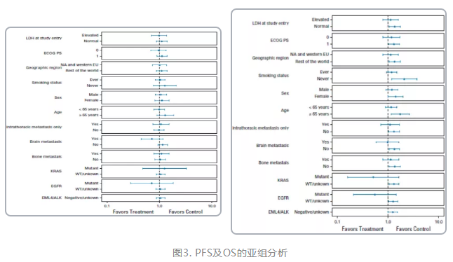 第二,尽管在前期研究中发现LDH水平有可能与疗效有关,但III期临床研究中并未发现这一相关性,且从生存曲线图来看,两条曲线自始至终紧密交叉,甚至联合治疗组在单药治疗组的下方,这就意味着有可能不存在获益的亚组人群;