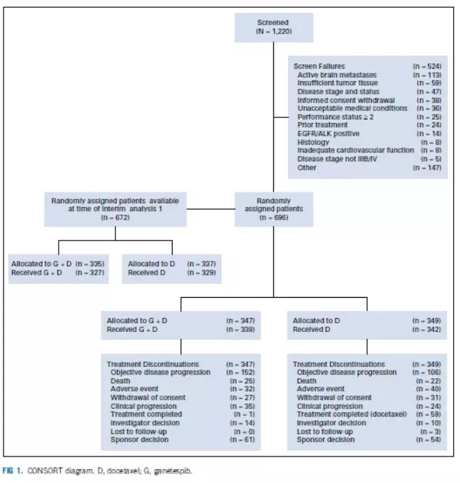 这是一项前瞻性、III期临床研究,入组患者为IIIB或IV期的肺腺癌且诊断至入组时间至少相差6个月,驱动基因均为阴性。患者需既往接受过含铂双药治疗后进展,PS评分为0-1分且有足够的器官功能。稳定性脑转移患者允许入组。但近4周体重下降超过10%的患者不允许入组。多西他赛及Ganetespib的治疗剂量分别为75mg/m2和150 mg/m2(第一天和第15天应用),每21天一个治疗周期。接受Ganetespib治疗的患者常规给予洛哌丁胺治疗以预防腹泻的发生。每6周进行一次疗效评估。研究的主要终点为OS,次要研究终点为PFS,LDH升高患者的OS。患者基于PS评分状态(0 vs. 1)、基线LDH水平(低于正常上限 vs. 高于正常上限)及地区(亚洲vs.欧洲 vs. 美洲)进行分层。研究设置两次中期分析,并采用O’Brien-Fleming法矫正显著性水准。