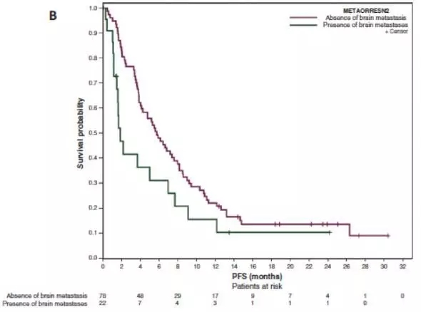 26例有脑转移和89例无脑转移患者的中位PFS分别为1.9个月和5.4个月(图3)。