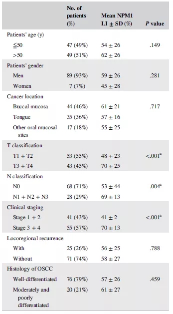 在肿瘤较大(P<0.001)、淋巴结转移阳性(P=0.004)和临床分期较高(P<0.001)的OSCC标本中,NPM1 LIs的均值显著较高。然而,NPM1蛋白在口腔鳞癌组织中的表达水平与患者的年龄、性别、肿瘤部位、肿瘤复发以及口腔鳞癌的分化程度均无显著相关性。NPM1表达与96例口腔鳞癌患者临床病理参数的关系如表1所示。