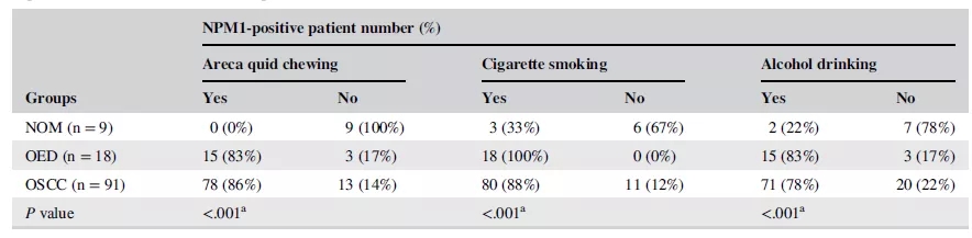 通过调查显示咀嚼槟榔、吸烟及饮酒与NOM、OED和OSCC中NPM1阳性表达相关。咀嚼槟榔者的NPM1阳性率呈阶梯状上升,NOM为0%,OED为83%,OSCC为86%。在有吸烟或饮酒习惯的患者中也获得了类似的结果。数据显示,在口腔癌变过程中,高风险的口腔习惯可能导致NPM1表达逐步升高。