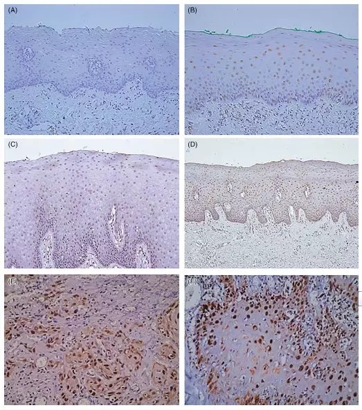NPM1阳性表达主要出现于上皮细胞或癌细胞的细胞核内。一般来说,正常口腔粘膜上皮NPM1阴性或在上皮的基底细胞层有极少的NPM1阳性细胞(图1A)。与NOM标本(图1 B-D)相比较,在OSCC肿瘤巢细胞中发现中等至强的核NPM1阳性染色(图1E-F)。29例NOM中10例(35%)、45例OED中25例(56%)、96例OSCC中93例(97%)NPM1染色为阳性。从NOM、OED到OSCC样本,其平均NPM1标记指数(LIs)显著增加。