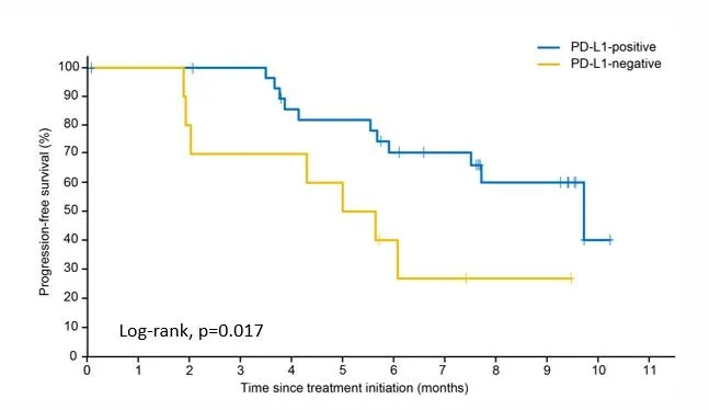 值得注意的是,探索性研究发现,PD-L1阳性患者的中位PFS期较PD-L1阴性患者明显延长[9.6个月(7.6个月-未达到)对比5.3个月(2.0个月-未达到),P=0.017],治疗缓解率分别为69%和50%(P=0.281)。