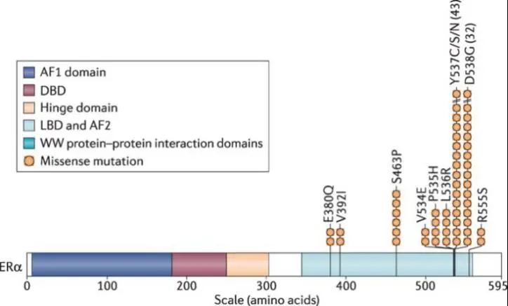 ESR1突变已经被证实与乳腺癌内分泌治疗耐药密切相关,在经过至少一线内分泌治疗的转移性乳腺癌患者中,ESR1 LBD突变的阳性率在54%左右,检出率最高的几个突变位点依次为D538G、Y537S、Y537N、Y537C,在对ESR1 LBD突变的功能进行评估后,研究证实Y537S位点突变型ER的活性最高,表现为非配体依赖的固有活性,雌激素缺乏条件下,野生型ER活性弱,但突变型ER仍显示出ER反应元件依赖的转录及靶基因表达,活性约为野生型的30-60倍,其转录调控的下游基因相比ESR1野生型也发生了变化。