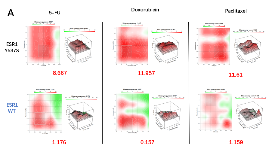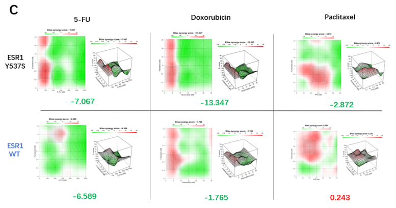 研究人员利用Bliss药物协同效应实验测试氟维司群与三种化疗药物(5-FU、阿霉素、紫杉醇)在MCF7、T47D、MCF7 Y537S、T47D Y537S细胞系以及MCF7 P53敲除细胞系中的药物相互作用,发现只有在P53野生型细胞中氟维司群与化疗具有药物协同作用,同时拥有Y537S突变的细胞系具有更高的协同效应分数,而无论P53突变还是P53敲除后,氟维司群与化疗均为拮抗作用(如图3)。