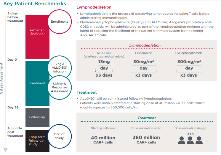 ALLO-501是一种靶向CD19的异体CAR-T细胞产品,异体CAR-T相对于自体CAR-T细胞,具有容易获得、无需等待(CAR-T制备时间)、T细胞不受患者免疫功能状态影响等优势,可使得更多患者有机会接受CAR-T细胞治疗。自身T细胞的排异以及异体CAR-T容易产生移植物抗宿主病(GVHD)。因此,异体CAR-T输注前进行彻底的宿主淋巴细胞清除将有助于CAR-T细胞在体内存活扩增,而敲除异体T细胞的TCR分子,则可避免发生GVHD。