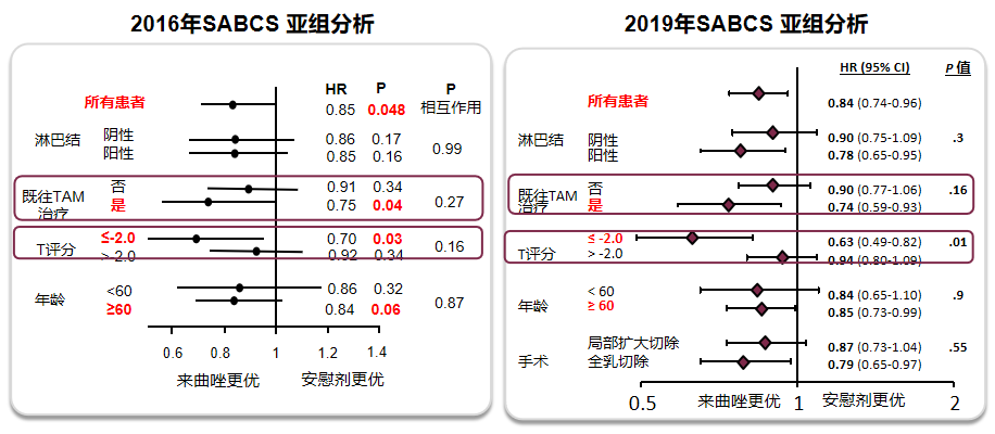 其次,在亚组分析中,虽然整体上延长来曲唑对DFS的影响,在年龄、淋巴结状态、既往是否使用过他莫昔芬、手术类型,以及骨密度评分方面无显著性差异;但对于使用过他莫昔芬(7年和10年随访的HR为 0.75和0.74)、骨密度较低(HR 0.70和0.69)的人群获益似乎更明显。