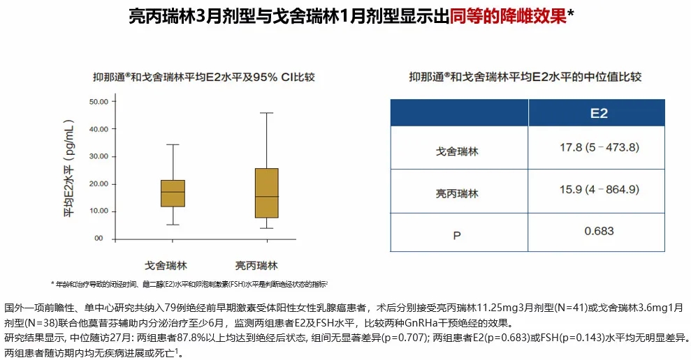3月剂型和1月剂型降雌效果相当:国外一项前瞻性、单中心研究对比了亮丙瑞林3月剂型和戈舍瑞林1月剂型干预绝经的效果,中位随访27个月,患者87.8%以上均达到绝经后状态,组间无显著差异,两种药物降低雌二醇(E2)或卵泡刺激素(FSH)的水平无明显差异。
