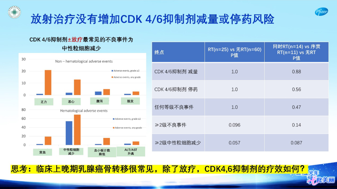 陕西中医药大学第二附属医院代引海教授:在HR+HER2-晚期乳腺癌患者合并内脏转移中,哌柏西利+AI能给患者带来巨大获益。同时哌柏西利可显著缓解骨转移疼痛,提高患者生存质量。对中性粒细胞减少并发症,哌柏西利的应用对患者生存质量几乎没有影响。期待该药尽快进入医保。