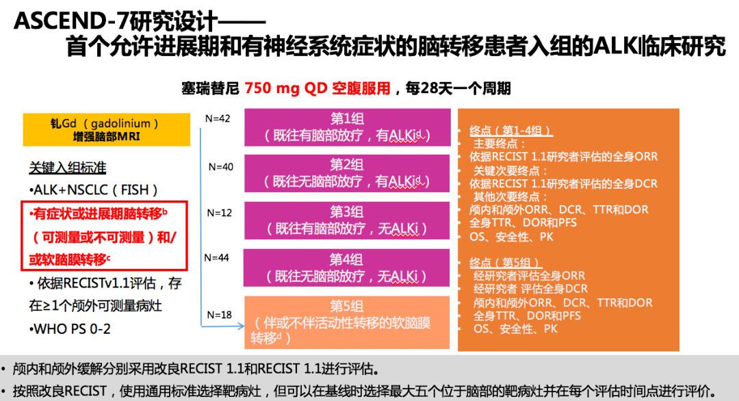 ASCEND-7研究是唯一专门针对进展期、有CNS症状的脑部和/或脑膜转移的全球II期临床研究,研究分5组,由于入组患者的基线各不相同,可作为5个单臂研究来解读: