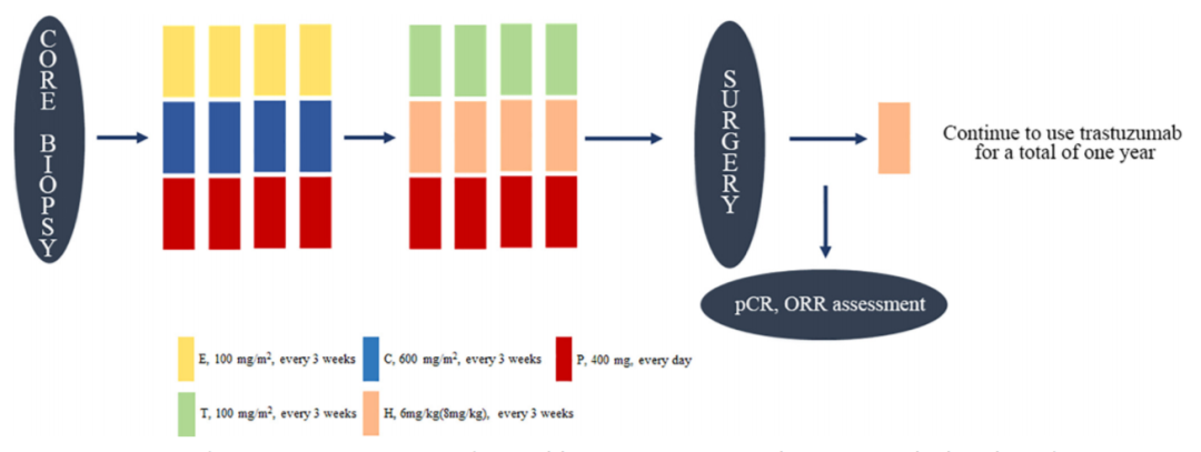 研究设计:本研究是一项前瞻性、单臂、单中心的Ⅱ期临床试验(SWH-B004),入组来自中国人民解放军陆军军医大学第一附属医院(重庆西南医院)的Ⅰ~Ⅲ期HER2阳性乳腺癌患者,术前给予8周期吡咯替尼联合4周期表柔比星+环磷酰胺序贯4周期多西他赛+曲妥珠单抗(P+EC-TH,剂量方案见图1)治疗。研究的主要终点为tpCR(ypT0/is,ypN0),次要终点包括ORR、安全性等。