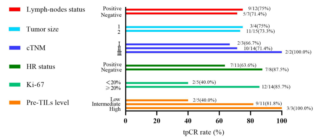 主要终点:在19例可用于疗效分析的患者中,有14例达到了病理完全缓解,即吡咯替尼联合曲妥珠单抗新辅助治疗的tpCR为73.7%(95% CI:48.8~90.9),在II-III期患者中,tpCR率可高达75%。值得注意的是,2例HER2阳性的ⅢC期(存在同侧锁骨上/下淋巴结转移)患者也获得了pCR。