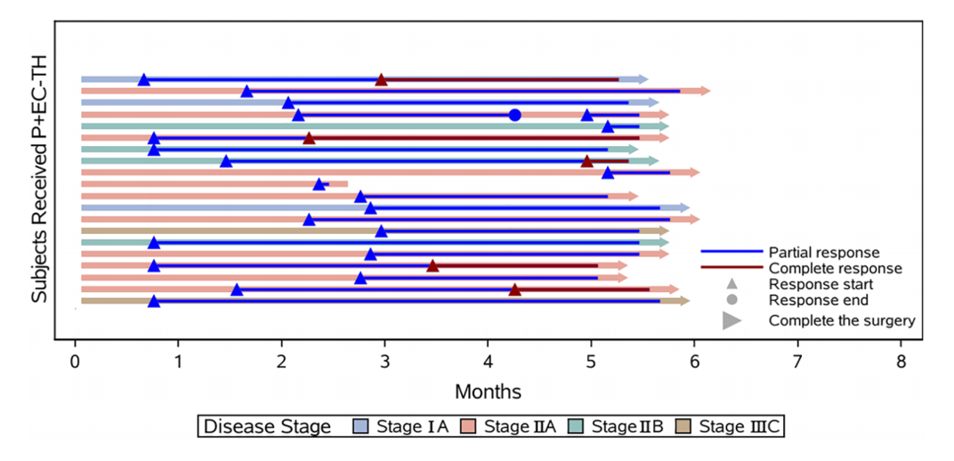 次要终点:在完成前4个周期的P+EC治疗后,单独吡咯替尼联合化疗即显示了较好的抗肿瘤活性,ORR为75%;而完成8周期的P+EC-TH治疗后,5例患者达到CR,14例患者达到PR,ORR为100%。