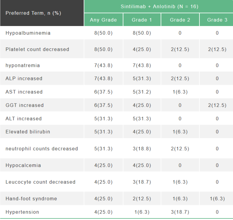 最常见的治疗相关不良事件(TRAEs)为1-2级的血小板减少(50%)、AST升高(37.5%)、ALT升高(31.3%)和胆红素升高(31.3%)、中性粒细胞计数下降(31.3%)、白细胞减少(25%)、高血压(25%)和手足综合征(25%)。6例患者经历了可控的3级TRAEs,没有4/5级TRAEs。7例患者需要减少安罗替尼剂量(4例减至10mg,3例减至8mg)。无因TRAEs导致的治疗退出。
