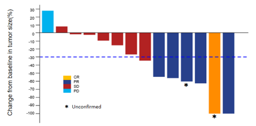 14例可评估的患者中,ORR为42.9%(6/14),1例CR,5例PR,7例SD,DCR为92.9%(13/14)。中位DoR未到达(95%CI:9.0个月 vs NR),数据截止时所有的肿瘤缓解仍在持续中。6个月PFS率为78.8%(95%CI:38.1~94.3%),中位PFS未到达。