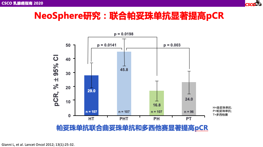 程琳教授:医生对疾病的考虑主要是两方面,有效性和安全性。疗效要好,安全性也好的药物才是一个最理想的药物。我一般会根据一些大型临床试验的数据,以及在临床实践当中来实际观察药物的疗效和安全性。关于疗效,HERA研究,NCCTG N9831等,都毋庸置疑地奠定了曲妥珠单抗的地位,相对新上市的帕妥珠单抗出现后,新辅助治疗相关的NeoSphere研究也显示,赫帕双靶+多西他赛表现出碾压式的优势,患者pCR率达到39.3%,几乎是曲妥珠单抗单靶+多西他赛数据(21.5%)的翻倍,而且其中只有赫帕双靶,不含化疗的研究组的pCR都能高于10%,更是说明赫帕双靶免化疗的治疗模式疗效是很确切的。