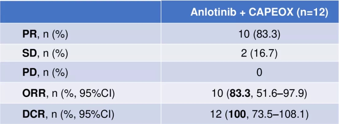 截止2020年9月15日,已成功入组19例患者。12例患者完成1次及以上的肿瘤评估:其中10例为PR,2例为SD。ORR为83.3%(95%CI:51.6%~97.9%),DCR为100% (95%CI: 73.5%~108.1%)(见下图)。3级以上的副反应包括高血压(n=8)、腹泻(n=3)、高甘油三酯血症(n=2)、白细胞及中性粒细胞减少(n=3)、肝功能异常(n=1)、小肠梗阻(n=1)、恶心呕吐(n=1)。无5级不良反应。其中1例小肠梗阻的患者在安罗替尼停药14天后接受了急诊手术治疗,在术中及围手术期的治疗中,未发生明显的出血及伤口愈合障碍。