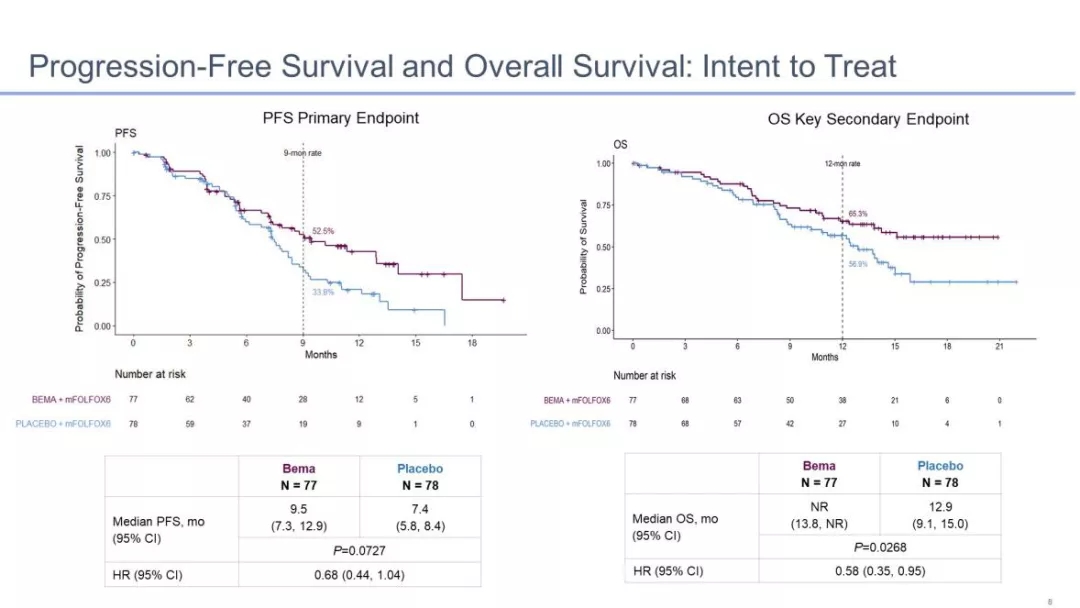 方法:FIGHT研究(NCT03343301)是一项全球性、随机、双盲、安慰剂对照的Ⅱ期临床试验。入组患者标准为免疫组化(IHC)分析显示FGFR2b过表达阳性或循环肿瘤DNA (ctDNA)的FGFR2扩增阳性、非HER2+的不可切除局部进展期或转移性胃癌患者。患者接受mFOLFOX6治疗,按1:1随机分配每2周接受bema 15mg/kg或安慰剂(pbo),第8天再加一次7.5mg/kg bema/pbo。治疗一直持续到疾病进展、无法耐受的毒性或死亡。主要终点是研究者评估的无进展生存期(PFS),关键次要终点包括总生存(OS)、总缓解率(ORR)和不良事件发生率。对PFS、OS和ORR依次进行统计学显著性检验(双边α为0.2)。