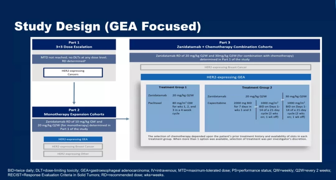 方法:在这项由3部分组成的Ⅰ期研究(NCT02892123)中,ZW25(10 mg/kg QW,20 mg/kg Q2W,或30 mg /kg Q3W)作为单药给药(第1部分和第2部分;QW或Q2W)或联合化疗(第3部分;Q2W或Q3W)。入选标准包括通过免疫组化(IHC)3+或IHC 2+评估的具有HER2表达、标准护理治疗后进展的GEA,根据校准的RECIST 1.1版评估可测量的疾病(仅第2部分要求)(图2)。