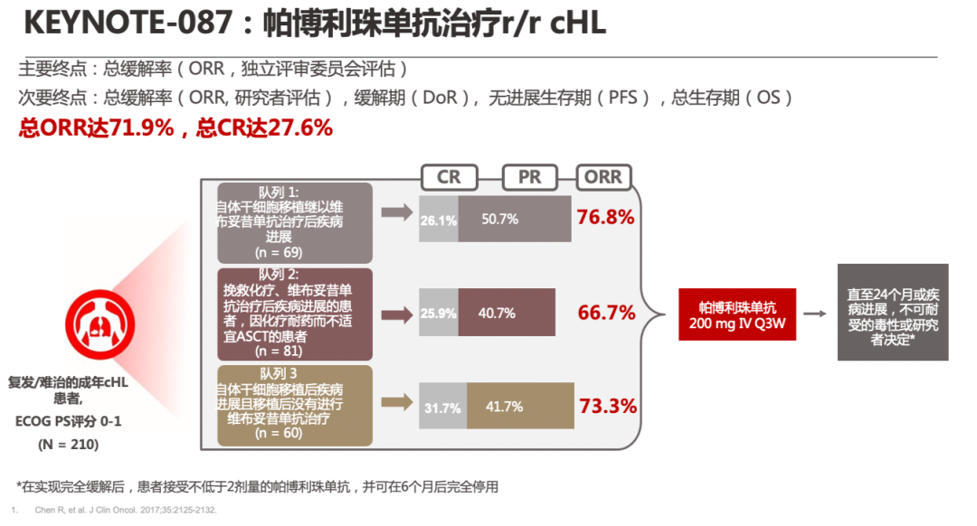 另外,更重要的新药是关于免疫检查点抑制剂在HL中的应用。进口的O药(Opdivo,Nivolumab)和K药(Keytruda,Pembrolizumab)获得相应批准在中国上市,几乎同时我们国家自主研发创新的新药PD-1陆续上市(图2)。截至目前,我们作为牵头单位进行临床试验上市的就有恒瑞公司的PD-1、百济的PD-1、陆续还将有誉衡的PD-1和康方的PD-1等其他厂家的产品。这一类新药也对复发的经典型霍奇金淋巴瘤病人带来了极好的疗效。