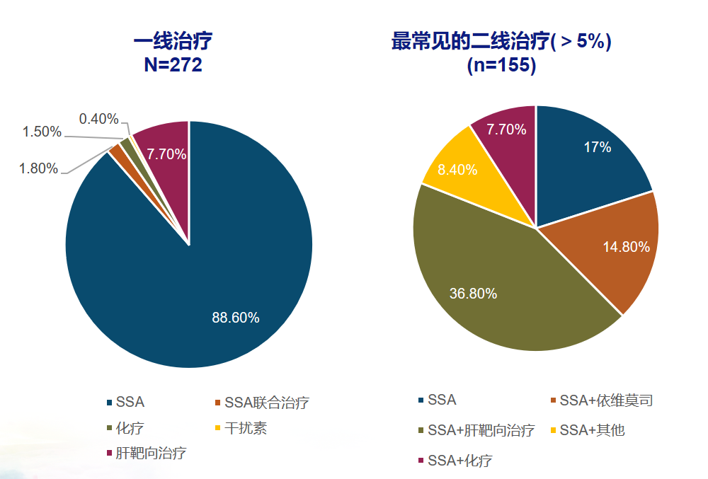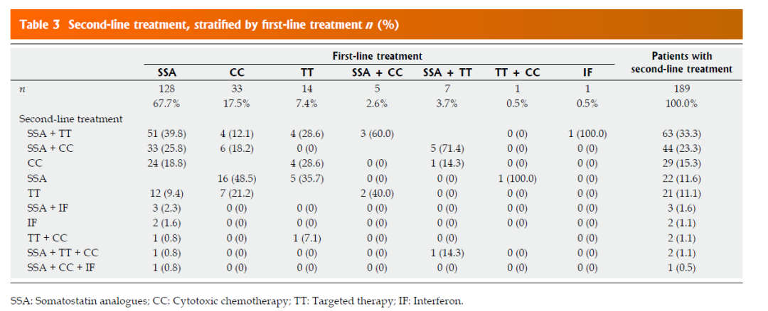 SSA是最常见的初始药物治疗,59.6%的患者使用SSA单药一线治疗,33.3% 接受化疗、3.6% 接受靶向治疗、 0.5% 接受干扰素,其余患者接受联合治疗。一线进展后有33.3%的患者选择SSA联合靶向、23.3%选择SSA联合化疗等治疗。总体平均一线治疗时长为361天,其中SSA单药治疗平均为449天,化疗为215天,靶向治疗为267天。59%的患者在一线治疗后停止治疗,只有不到10%的患者接受二线治疗。综上所述,一线治疗以使用SSA单药最为常见,其次是化疗,一线进展后选择SSA联合靶向治疗者最为常见。