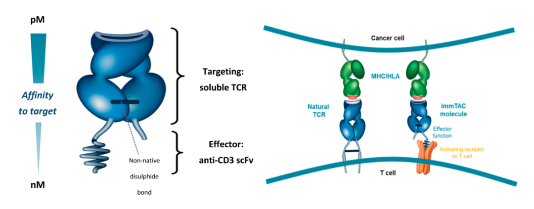 Tebentafusp(Tebe)是一种新型双特异性蛋白,由可溶性TCR(靶向gp100:在黑色素细胞和黑色素瘤中表达的抗原)与抗CD3免疫效应器结构域融合而成。这个蛋白相当于一个双功能杂合抗体,一头识别gp100,一头识别CD3,可以把黑色素瘤细胞拉到T细胞旁,同时完成识别和杀伤。由于这个药物是研发了针对gp-100的TCR,与TCR-T细胞治疗的原理有相似之处,因此也被戏称为“TCR疗法”。