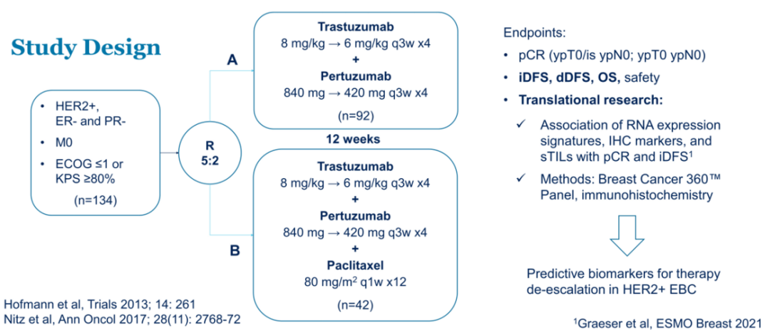 方法:前瞻性多中心WSG-ADAPT-HR-/HER2+Ⅱ期试验是ADAPT伞型系列研究的一部分。cT1-cT4c,cN0-3期的HR-/HER2+EBC患者(n=134)随机分入妥妥双靶联合/不联合紫杉醇周方案化疗组。所有肿瘤均为HR-(ER和PR<1%),HER2+(中心实验室确认FISH 2+阳性或免疫组化显示3+)。主要终点为pCR(ypT0/is/ypN0);在pCR的患者中允许省略后续化疗。试验目的是比较P+T+paclitaxel(Pac)组的pCR与P+T组的早期应答(定义为3周后细胞数量低和/或Ki67下降>30%)。由于在P+T+Pac组中观察到pCR优势,试验提前终止。次要终点包括安全性、5年(远处)DFS、OS和转化研究。研究采用Cox回归分析。使用乳腺癌360面板评估PAM50亚型。