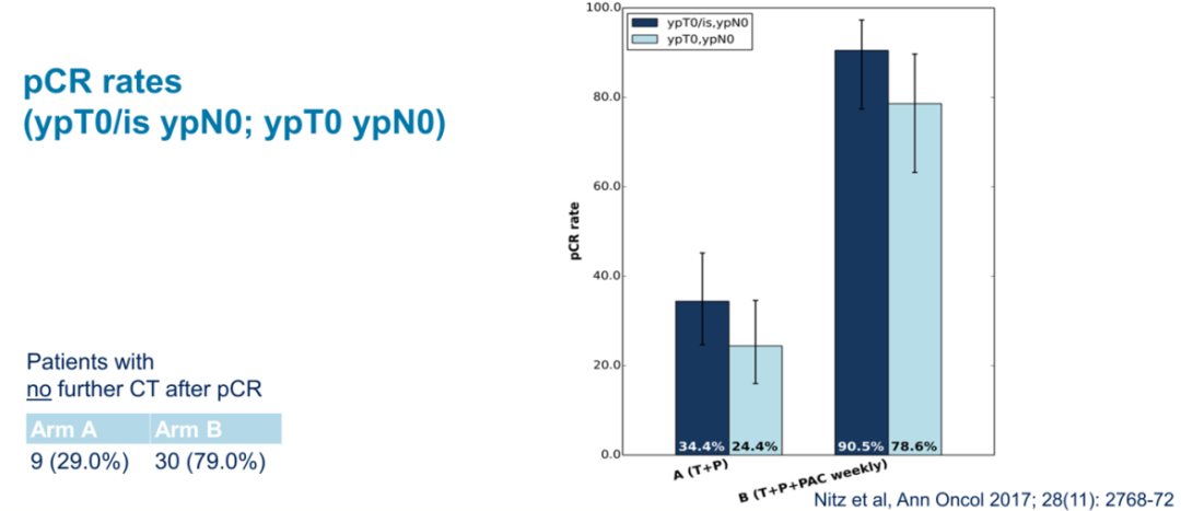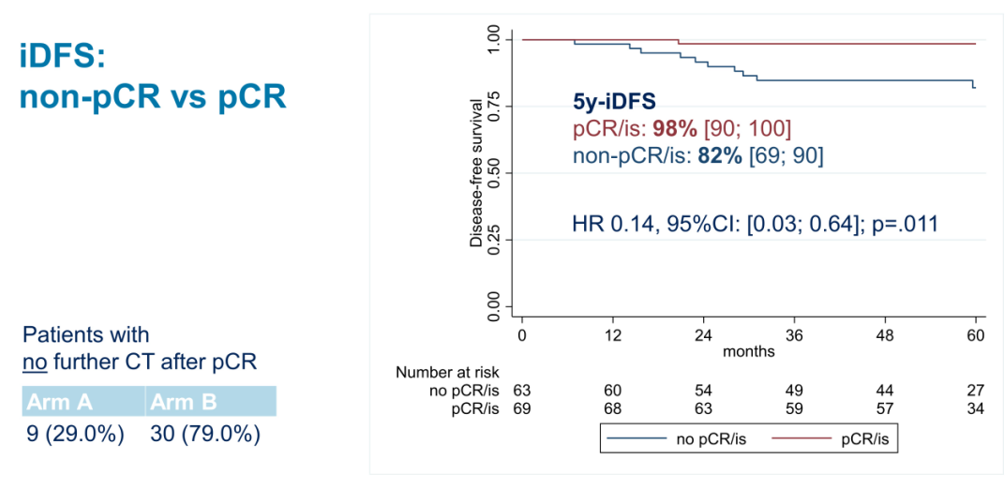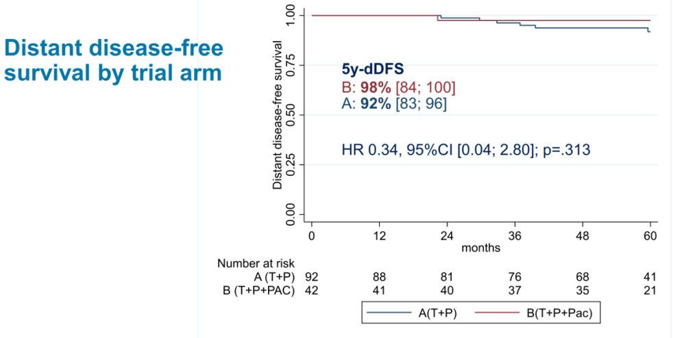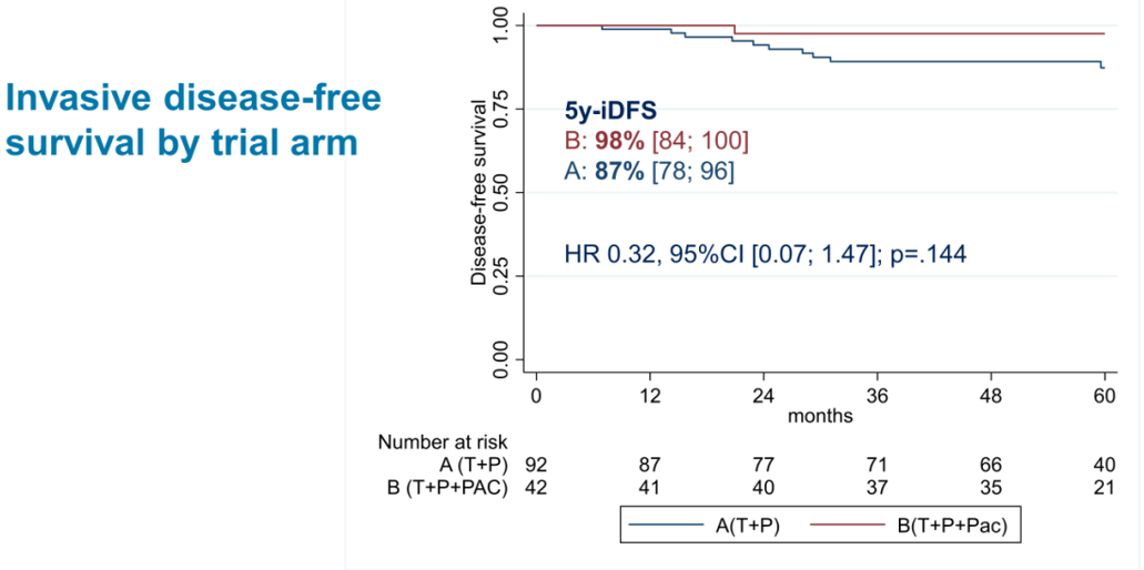 结果:134例患者随机分为P+T组(n=92)和P+T+Pac组(n=42)。60%的肿瘤为cT2-4期,临床淋巴结阳性率为42%。中位随访5年后,各研究组间在DFS、DDFS和OS方面无显著差异;在整个ITT人群中仅观察到13例iDFS事件(7例DDFS)。12周治疗后的pCR(与非pCR相比)与iDFS的改善密切相关(与研究组无关)(5y iDFS 98% Vs 87%,HR=0.32,95%CI:0.07~1.47;P=0.144)。