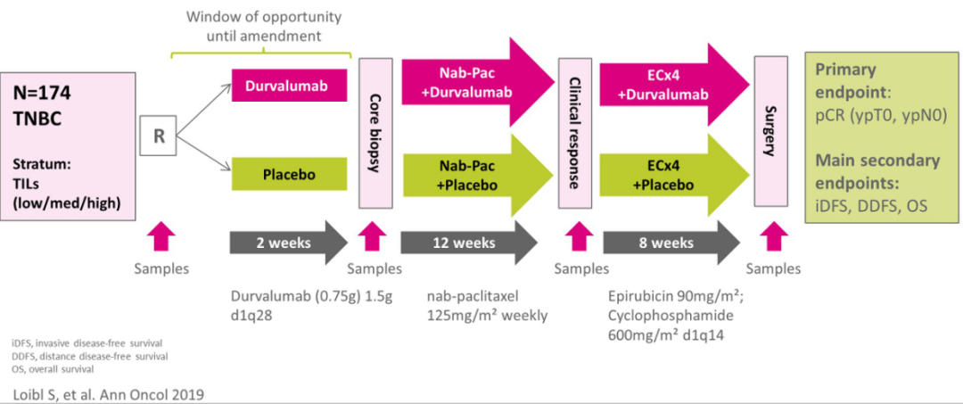 背景:GeparNuevo试验研究了在早期TNBC患者的标准新辅助化疗(NACT)中加入durvalumab——一种抗PD-L1检查点抑制剂(CPI)。Durvalumab增加了患者的病理完全缓解(pCR)率,尤其是在化疗开始前单独使用Durvalumab治疗的这部分患者(Loibl et al. Ann Oncol 2019)。