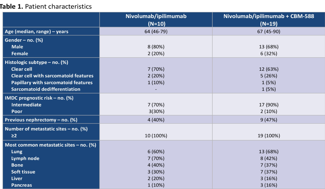 研究背景:最近的证据表明,肠道微生物组是转移性肾细胞癌(mRCC)中免疫检查点抑制剂(ICI)活性的有效介质,具有特定的细菌种类和累积的微生物多样性驱动反应(Routy等Science 2018;Salgia等Eur Urol,2020年)。我们检测了产丁酸梭状芽胞杆菌(CBM-588的主要成分)是否能够调节接受nivolumab/ipilimumab(N/I)治疗的mRCC患者(pts)的肠道微生物群,从而改善临床结果。