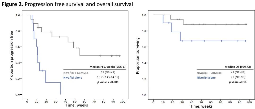 配对粪便标本的宏基因组测序显示接受N/I+CBM-588治疗的患者中Bifidobacterium bifidum和Bifidobacterium adolescentis从基线检查到第12周分别提高了8倍和6倍(图2)。丁酸梭菌仅在接受CBM-588的患者中检测出。致病菌如大肠杆菌和克雷伯菌属在未接受CBM-588治疗的患者中更为多见。接受N/I+CBM-588治疗的患者的RR显著高于单独接受N/I治疗的患者(59% vs 11%;P=0.024)(图3)。中位PFS在接受CBM-588的治疗组中延长(N/I+CBM-588:NR,N/I :11周;P<0.001)(图4)。研究组间3 / 4级毒性无显著差异(表2)。