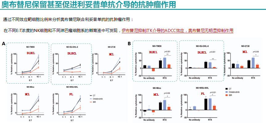1、奥布替尼具有最佳激酶选择性,对NK细胞上的ITK靶点的抑制作用很弱,不影响抗CD20单抗的ADCC效应