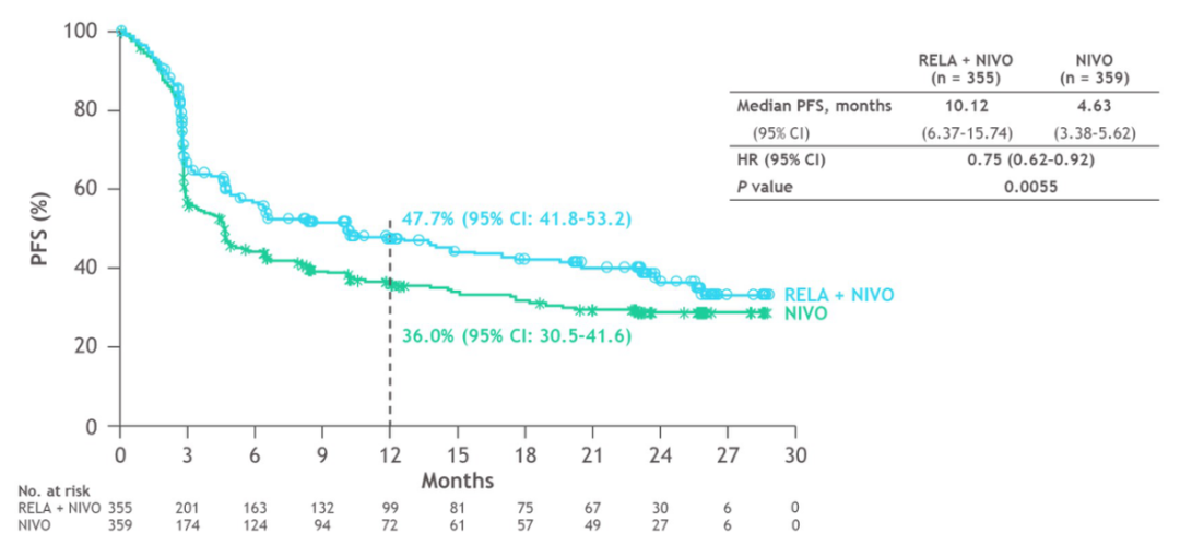 结果:714 名患者被随机分配至 RELA+NIVO组(n = 355)或 NIVO组(n = 359)。治疗组之间的患者特征基本平衡。中位随访时间为 13.2 个月。RELA+NIVO组的中位 PFS(10.1 个月 [95% CI:6.4~15.7])显着长于 NIVO 组(4.6 个月 [95% CI:3.4~5.6];风险比,0.75 [95%CI:0.6~0.9];P = 0.0055)。RELA+NIVO和 NIVO 的12个月 PFS 率分别为 47.7%(95% CI:41.8~53.2)和 36.0%(95% CI:30.5~41.6)。在各个关键亚组中RELA+NIVO组的PFS均优于对照组。