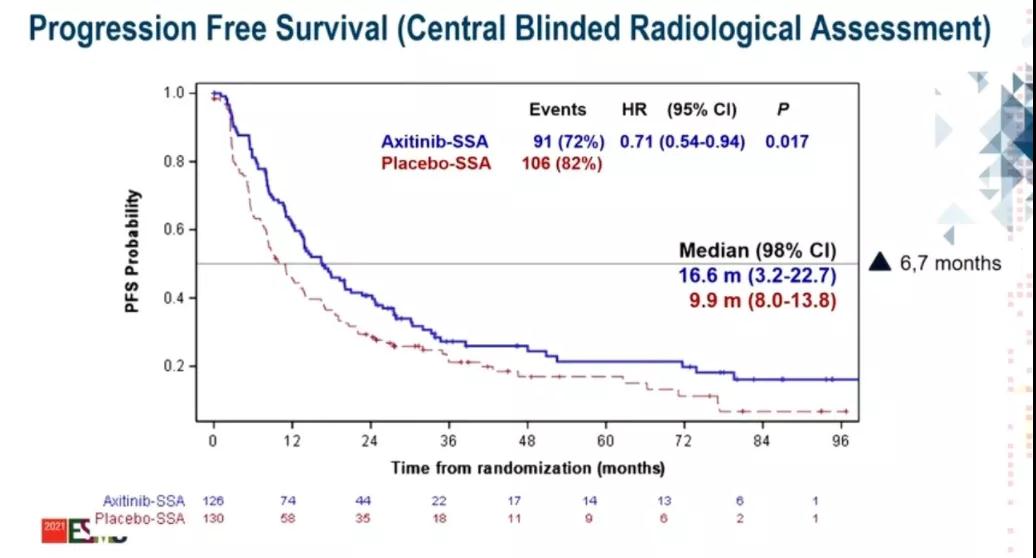 患者以1:1的比例随机接受长效奥曲肽(30mg IM q4w)+阿昔替尼(5mg BID)或安慰剂BID,直至疾病进展或毒性不可耐受。随机分组按从诊断到进入研究的时间分层(>或≤12个月)、原发肿瘤部位(胃肠道与非胃肠道)和Ki-67指数(≤ 5% vs >5%)。允许既往使用SSA、IFN和最多2线系统治疗,但不允许既往使用VEGF或VEGFR靶向药物。患者在研究开始前12个月内发生临床和/或放射疾病进展。主要终点是无进展生存期(PFS)。根据研究者评估的PFS结果已在ASCO GI 2021上公布。现在介绍盲法独立中心评估的PFS。