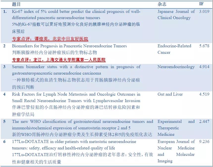 编者按:新一期“诺华NET之声”又和大家见面了。本期栏目中,中日友好医院的谭煌英教授将介绍和点评其研究团队发表的一项将5%的Ki-67指数作为pNETG1/G2分类界值的研究;上海交通大学附属第一人民医院的龙江教授将对一篇“判断胰腺神经内分泌肿瘤预后的生物标志物”的文章进行点评;此外,我们还将介绍一项来自北京大学肿瘤医院沈琳院长及其团队利用血清生物标志物进行胃肠胰腺神经内分泌癌预后判断的研究;以及一项对伴淋巴管侵犯的直肠神经内分泌小肿瘤进行淋巴结转移危险因素分析的研究;最新版WHO胃肠神经内分泌肿瘤分类及生长抑素受体2和5的免疫组化表达以及177Lu-DOTATATE治疗转移性神经内分泌肿瘤老年患者的研究。欢迎各位读者交流讨论。