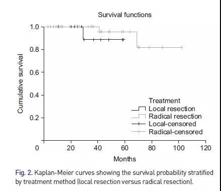 在750名患者中,有75名患者的肿瘤较小(≤1.5厘米),且有淋巴血管侵犯,其中31名患者只接受了内镜切除,44名患者接受了额外的根治性手术。在41例接受手术且数据可用的患者中,区域淋巴结转移率为48.8% (20/41)。在多变量分析中,Ki-67指数(比值比,6.279;95%CI:1.212~32.528;P = 0.029)是淋巴结转移的独立危险因素。在平均37.7个月的随访期间,手术组仅检测到1例复发。根治性切除和局部切除之间的总生存期无显著差异(P = 0.332)。