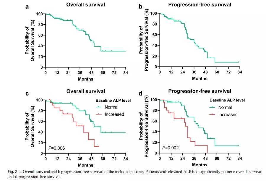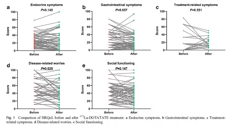研究共纳入71例患者(76.1%为原发部位为中肠)。诊断时的中位年龄和177Lu-DOTATATE治疗时的中位年龄分别为70岁和74岁。大多数(78.9%)患者完成了4个周期的177Lu-DOTATATE治疗。具有临床意义的骨髓抑制罕见(2.8%)。HRQoL无恶化,疾病特异性担忧(disease-specific worries)显著改善(P = 0.029)。66例患者的放射学缓解评估可用。部分缓解、疾病稳定和疾病进展分别为10例(15.2%)、52例(78.8%)和4例(6.1%)。中位PFS和OS分别为36.0和47.0个月。基线碱性磷酸酶升高与PFS(P = 0.002)和OS(P = 0.006)较差相关。